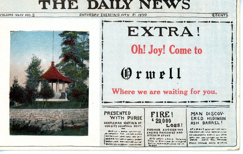 Handwritten and published documents, including letters, journals, diaries, ledgers by residents as well as seasonal workers; local business pamphlets, calendars, and ephemera; and records related to Orwell town government and organizations.