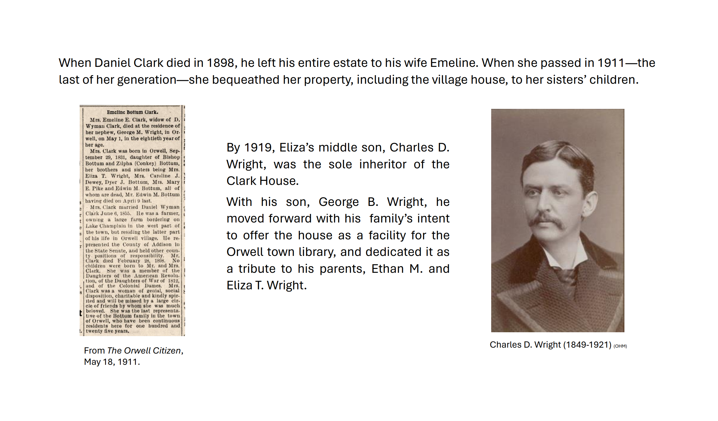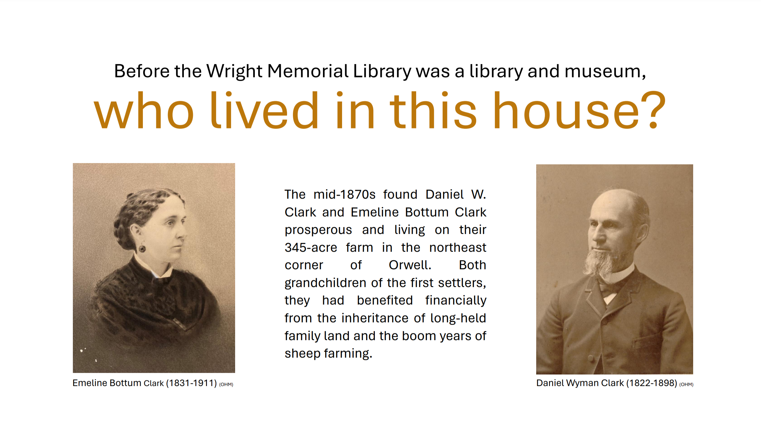 Although the museum is currently closed, visit the Orwell Free Library Vermont Room and experience the Orwell Historical Society’s current poster exhibit on the history of the Clark House, home to both the OFL and OHM.